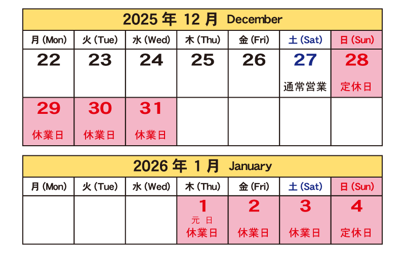 2025年度 年末年始の営業について 2025-12-122025-12-12 株式会社トライス お取引先各位 弊社 年末年始の営業について 平素は格別のお引立てを賜り、心よりお礼申し上げます。さて、弊社では誠に勝手ながら、本年度の年末年始休業日を下記の通りとさせて頂きます。休業期間中は何かとご迷惑をおかけし、恐縮ではございますが、何卒ご理解、ご承諾を賜りますよう、心よりお願い申し上げます。 記 弊社 年末年始休業日のお知らせ 年内最終営業日:2025年12月27日(土) 10:00~18:00(通常営業) 年末年始休業日:2025年12月28日(日)~ 2026年1月4日(日)※定休日を含む 年始営業開始日:2026年1月5日(月) 10:00~18:00(通常営業) 上記休業期間中は、全ての業務をお休みさせていただきます。休業期間中の買取、見積りのご依頼、お問い合わせ等につきましては、翌営業日に順次対応させていただきます。何卒ご了承下さい。 ※弊社休業日に到着予定の買取商品については、翌営業日に受領、検品、御入金となります。できる限り商品到着の当日中にご入金手続きを行いますが、入荷の混雑状況、お客様ご指定の金融機関によっては、各金融機関の翌営業日の処理となる場合がございます。予めご了承下さいますよう、お願い申し上げます。 株式会社 トライス代表取締役社長 川江 修司