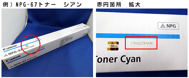 画像の「例)NPG-67トナー シアン」の場合では、箱上面(画像 赤円箇所)のホログラムシール横(画像 赤枠箇所)にスタンプされ、 2019年1月25日の製造ということがわかります。